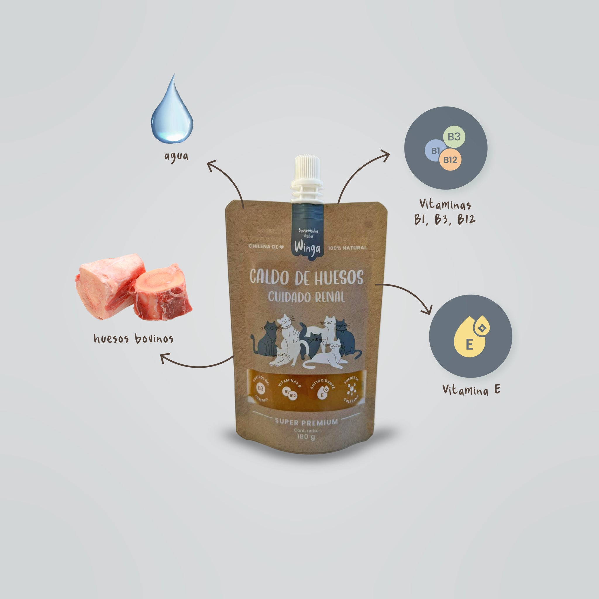 Ingredientes: Agua, huesos bovinos, vitamina E, B1, B3, B12, saborizante natural de hígado de cerdo (hidrolizado apto alérgicos).